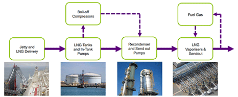 This illustration of a typical LNG terminal process represents the core operational systems that must be balanced and optimized to ensure efficient energy use and reliable gas delivery.