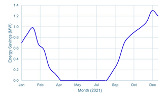 Over the course of a year, the plant can reduce energy usage by an average of 0.5 to 0.7 MW, translating to approximately $1 million in annual cost savings. These savings are particularly substantial during the winter months, when send-out rates are at their peak. Analysis showed that a more optimal plant configuration was available 60 to 80% of the time, highlighting consistent opportunities for efficiency improvements.