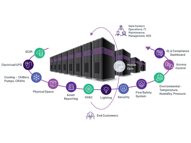 이는 실행 가능한 정보를 맥락화하여 데이터 센터 상태에 대한 전반적인 관점과 DCIM, 건물 관리, 기계, 전기 및 인력과 같은 데이터 센터 기능의 특정 영역을 관리하는 하위 시스템을 제공합니다.