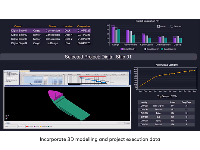 실시간 프로젝트 실행 상태에 대한 엔터프라이즈 시각화 보기를 달성합니다. 선박 건조, 연결된 작업자, 자산 성능 및 엔드 투 엔드 유지 관리 요구 사항에 대한 중앙 집중식 가시성을 위해 프로세스 및 비프로세스 정보 소스를 결합하여 인력 효율성과 주요 KPI 및 운영 조건에 대한 향상된 가시성을 통해 조선의 전체 운영 비용을 줄입니다.